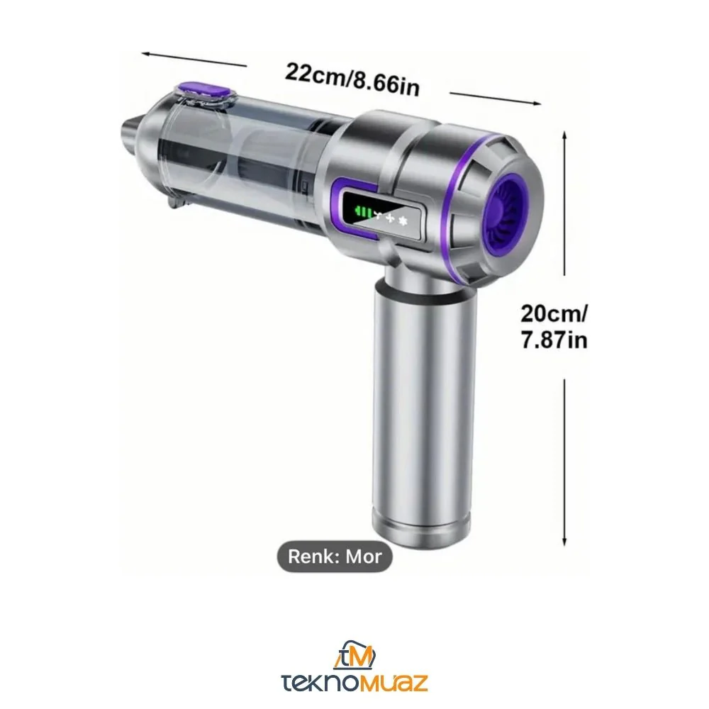 - Güçlü 20000PA emiş gücüne sahip bu kablosuz el süpürgesi, evinizin her köşesini derinlemesine temizlemenize yardımcı olur. Üç kademeli filtreleme sistemi sayesinde ince tozları bile etkili şekilde yakalar. Gümüş-mor renk kombinasyonuyla şık bir tasarıma sahip olan süpürge, çok fonksiyonlu başlıkları ve aksesuarlarıyla farklı yüzeylerde mükemmel temizlik sağlar. LED ekranı sayesinde cihazın durumunu kolayca takip edebilirsiniz. Ergonomik tasarımı ve hafif yapısı ile kullanım kolaylığı sunar. Çeşitli temizlik ihtiyaçlarınız için özel tasarlanmış başlıklar, dar alanlar için özel aparatlar ve fırça aksesuarları ile donatılmıştır. Kompakt boyutları sayesinde depolama kolaylığı sağlarken, kablosuz özgürlük ile evinizin her noktasına ulaşabilirsiniz. Her türlü zemin için ideal olan bu el süpürgesi, günlük temizlik rutininizi daha verimli hale getirir.